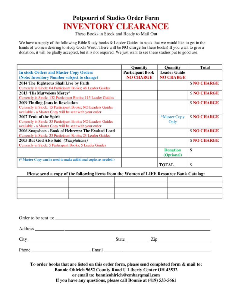 Potpourri of Studies Orders FormINVENTORY CLEARANCE These Books in Stock and Ready to Mail Out We have a supply of the following Bible Study books & Leader Guides in stock that we would like to get