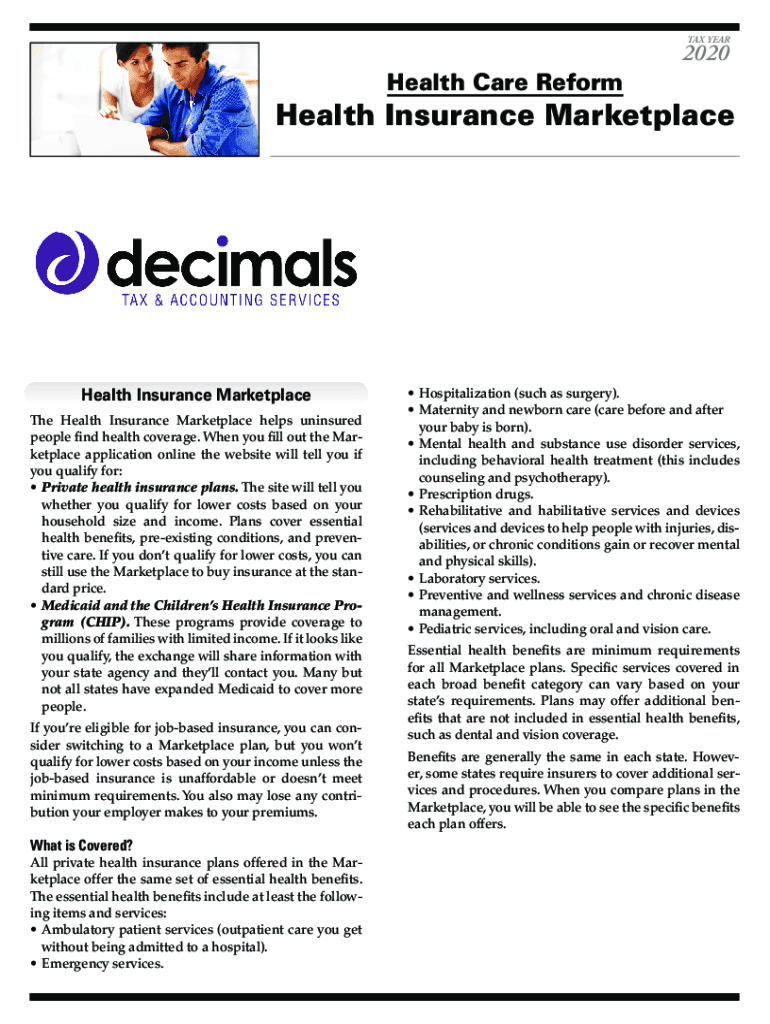 TAX Telehealth Care Reform2020Health Insurance MarketplaceHealth Insurance Marketplace The Health Insurance Marketplace helps uninsured people find health coverage. When you fill out the Marketplace