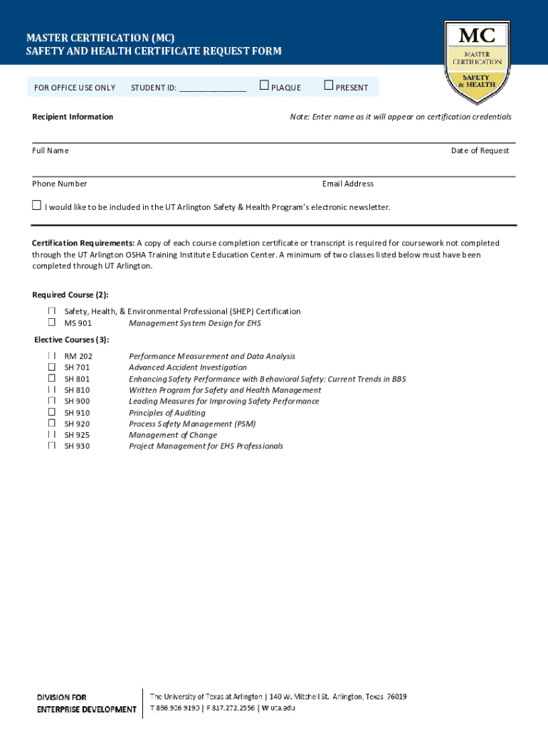MASTER CERTIFICATION (MC) SAFETY AND HEALTH CERTIFICATE REQUEST FORM FOR OFFICE USE ONLY Recipient InformationSTUDENT ID: PLAQUEPRESENTNote: Enter name as it will appear on certification credentialsFull