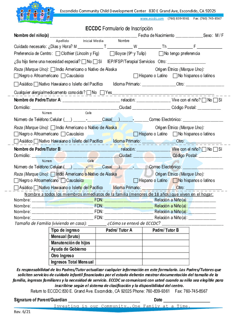 Escondido Community Child Development Center 830 E Grand Ave, Escondido, CA 92025 www.eccdc.com(760) 8399361Fax: (760) 7458567ECCDC Formulation de Inscripcin Hombre Del NIO(a) Tech de Nacimiento SEO: