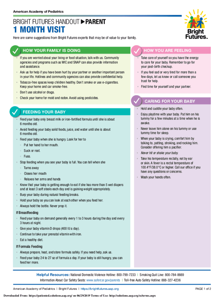 American Academy of PediatricsBRIGHT FUTURES HANDOUT PARENT1 MONTH Visited are some suggestions from Bright Futures experts that may be of value to your family. HOW YOUR FAMILY IS DOING YOU ARE FEELING