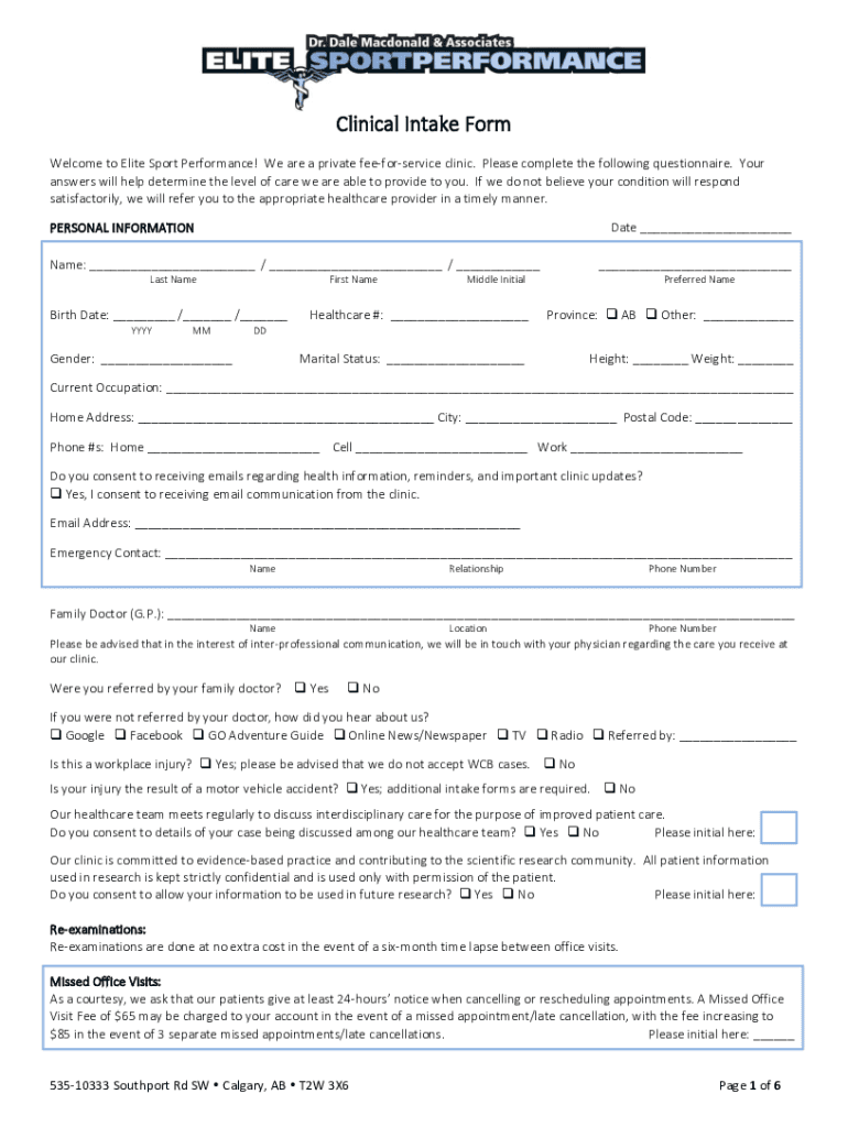Clinical Intake Form Welcome to Elite Sport Performance! We are a private feeforservice clinic. Please complete the following questionnaire. Your answers will help determine the level of care we are