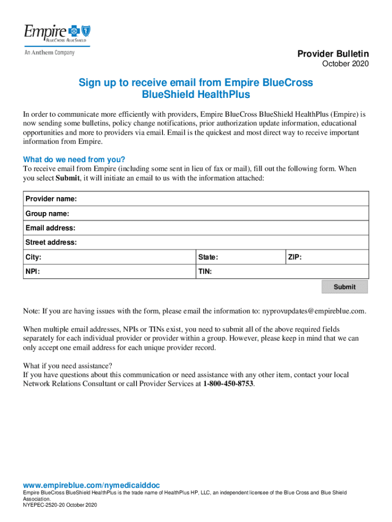Provider Bulletin October 2020Sign up to receive email from Empire Blue Cross Bluesier Healthful In order to communicate more efficiently with providers, Empire Blue Cross Bluesier Healthful (Empire)