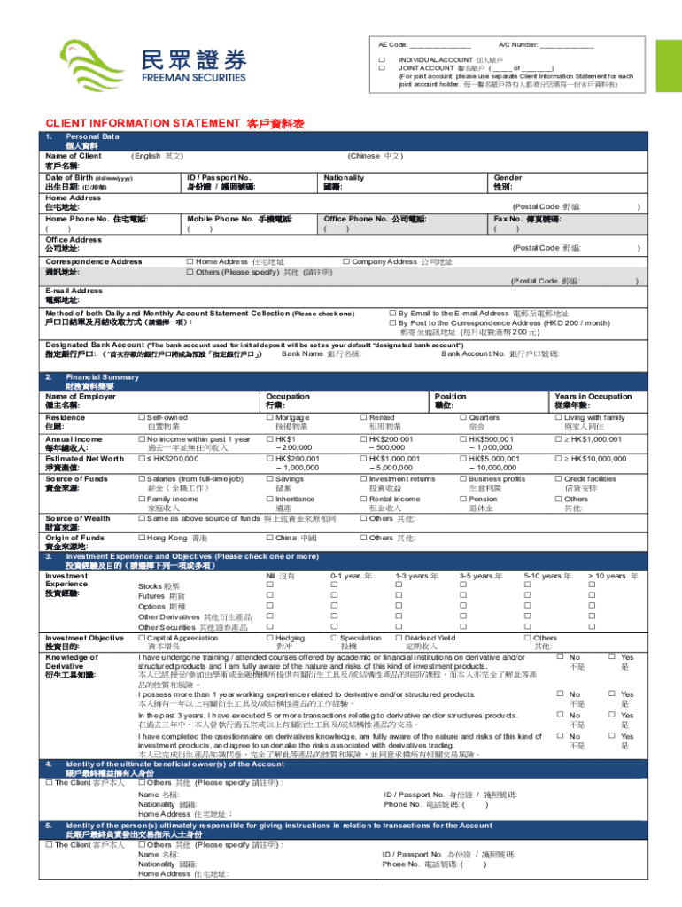 AE Code: A/C Number: INDIVIDUAL ACCOUNT JOINT ACCOUNT (of) (For joint account, please use separate Client Information Statement for each joint account holder. )CLIENT INFORMATION STATEMENT Personal