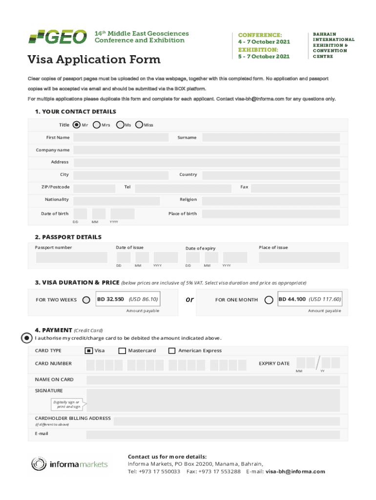14th Middle East Geosciences Conference and ExhibitionBAHRAIN INTERNATIONAL EXHIBITION & CONVENTION CENTRECONFERENCE: 4 7 October 2021 EXHIBITION: 5 7 October 2021Visa Application Formulae copies