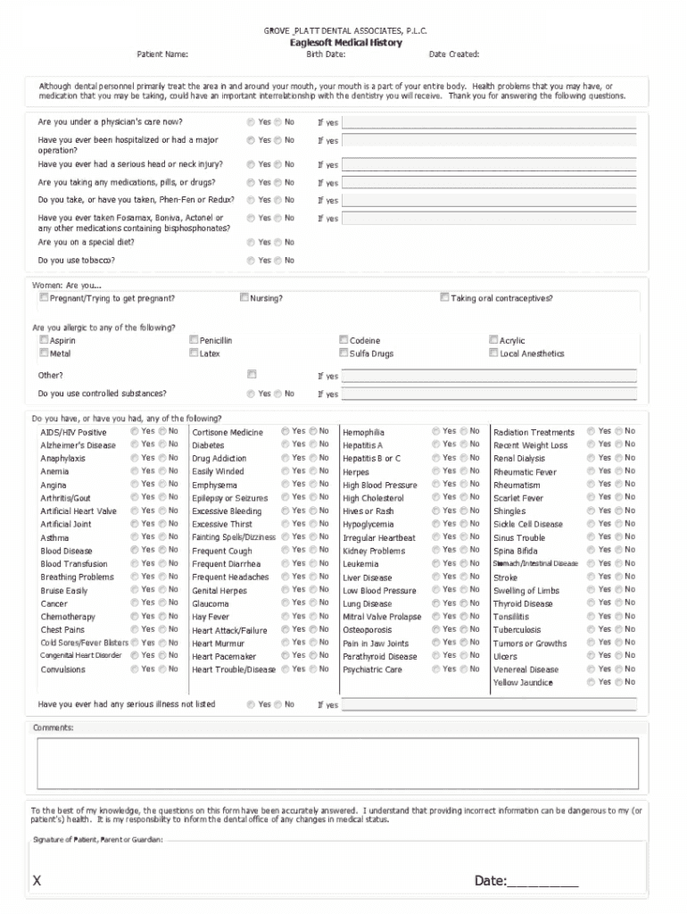 GROVE PLATT DENTAL ASSOCIATES, P.L.C. Eagle soft Medical HistoryPatient Name:Birth Date:Date Created:Although dental personnel primarily treat the area in and around your mouth, your mouth is a part
