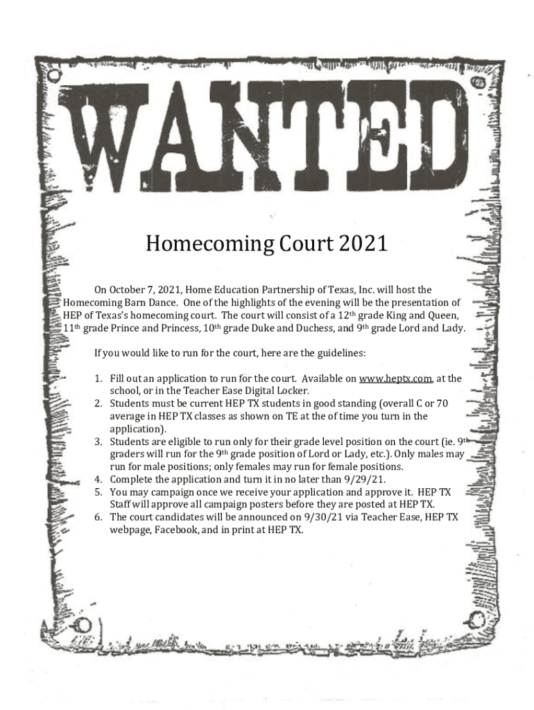 Homecoming Court 2021 On October 7, 2021, Home Education Partnership of Texas, Inc. will host the Homecoming Barn Dance. One of the highlights of the evening will be the presentation of HEP of Texas's