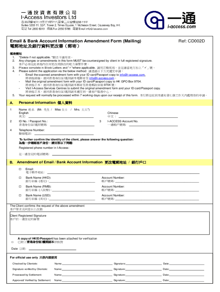 Email & Bank Account Information Amendment Form (Mailing) Ref: CD002D 1. *Delete if not applicable. * 2. Any changes or amendments in this form MUST be countersigned by client in full registered signature.