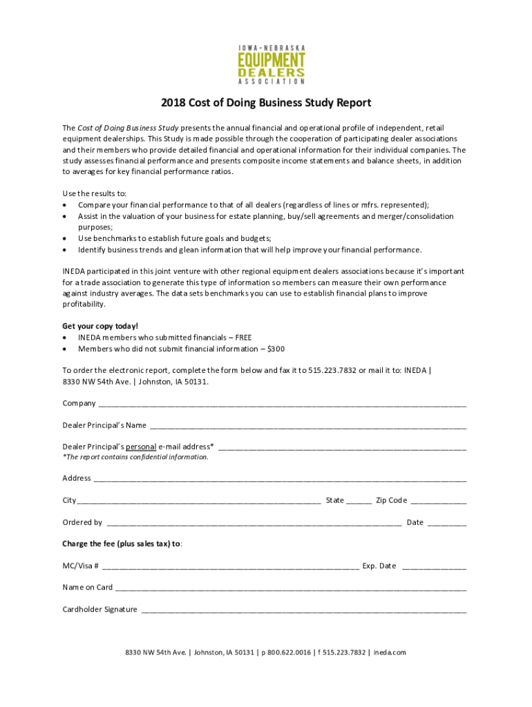 2018 Cost of Doing Business Study Report The Cost of Doing Business Study presents the annual financial and operational profile of independent, retail equipment dealerships. This Study is made possible