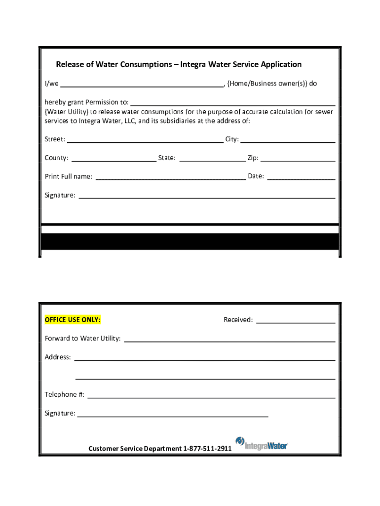 Release of Water Consumption Integral Water Service Application I/we, Home/Business owner(s) do hereby grant Permission to: Water Utility to release water consumption for the purpose of accurate calculation