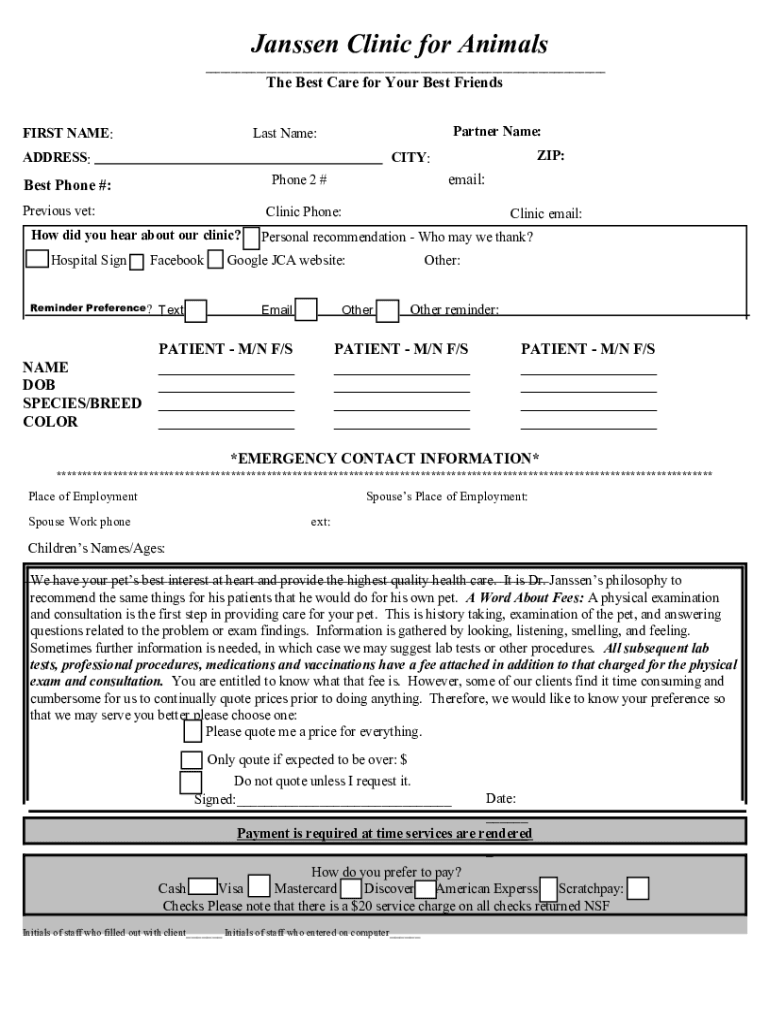 Janssen Clinic for Animals The Best Care for Your Best Friendships NAME:Partner Name:Last Name:ZIP:CITY:ADDRESS:email:Phone 2 #Best Phone #: Previous vet:Clinic Phone:Clinic email:How did you hear