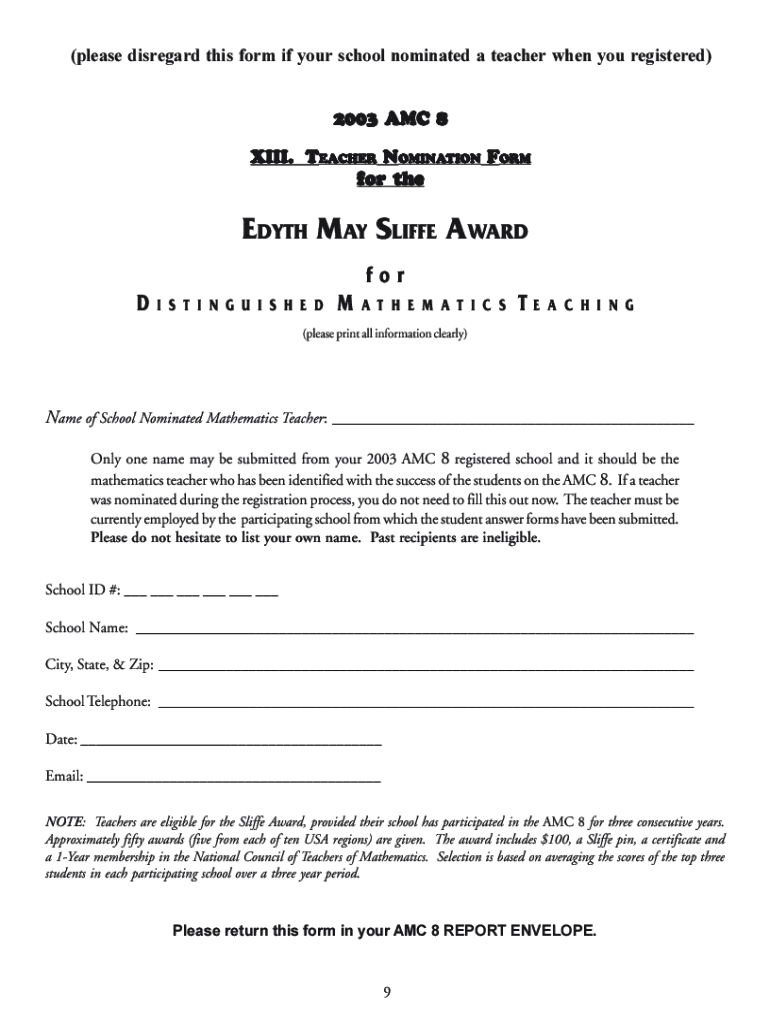 (please disregard this form if your school nominated a teacher when you registered)2003AMC8 XIII.TEACHERNOMINA INFORM NOMINATION fortheEDYTH MAY LIFFE AWARD f o r DI S T I N G U I S H E MA T H E M