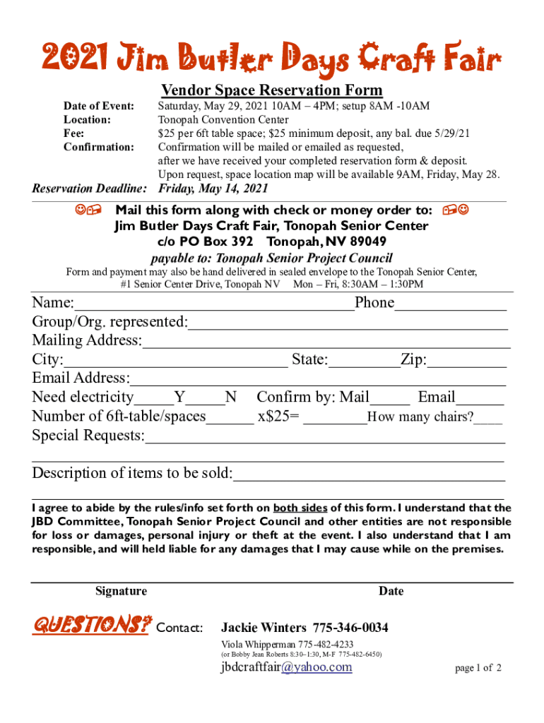 2021 Jim Butler Days Craft Fair Vendor Space Reservation Form Date of Event: Location: Fee: Confirmation:Saturday, May 29, 2021 10AM 4PM; setup 8AM 10AM Tooth Convention Center $25 per 6ft table space;