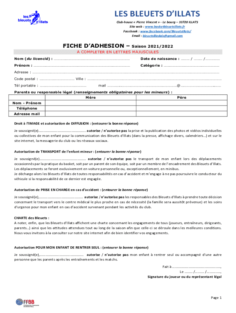 LES BLUETS DILL ATS Clubhouse Pierre Vincent Le Borg 33720 ILL ATS Site web : www.basketbleuetsillats.fr Facebook : www.facebook.com/BleuetsIllats/ Email : bleuetsilladais@gmail.comFICHE ADHESION