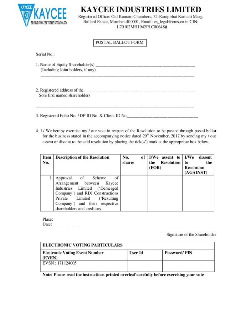 JAYCEE INDUSTRIES LIMITED Registered Office: Old Kazan Chambers, 32Ramjibhai Kazan Mary, Ballard Estate, Mumbai400001, Email: cs legal CMS.co.in: L70102MH1942PLC00648 POSTAL BALLOT FORM Serial No.: