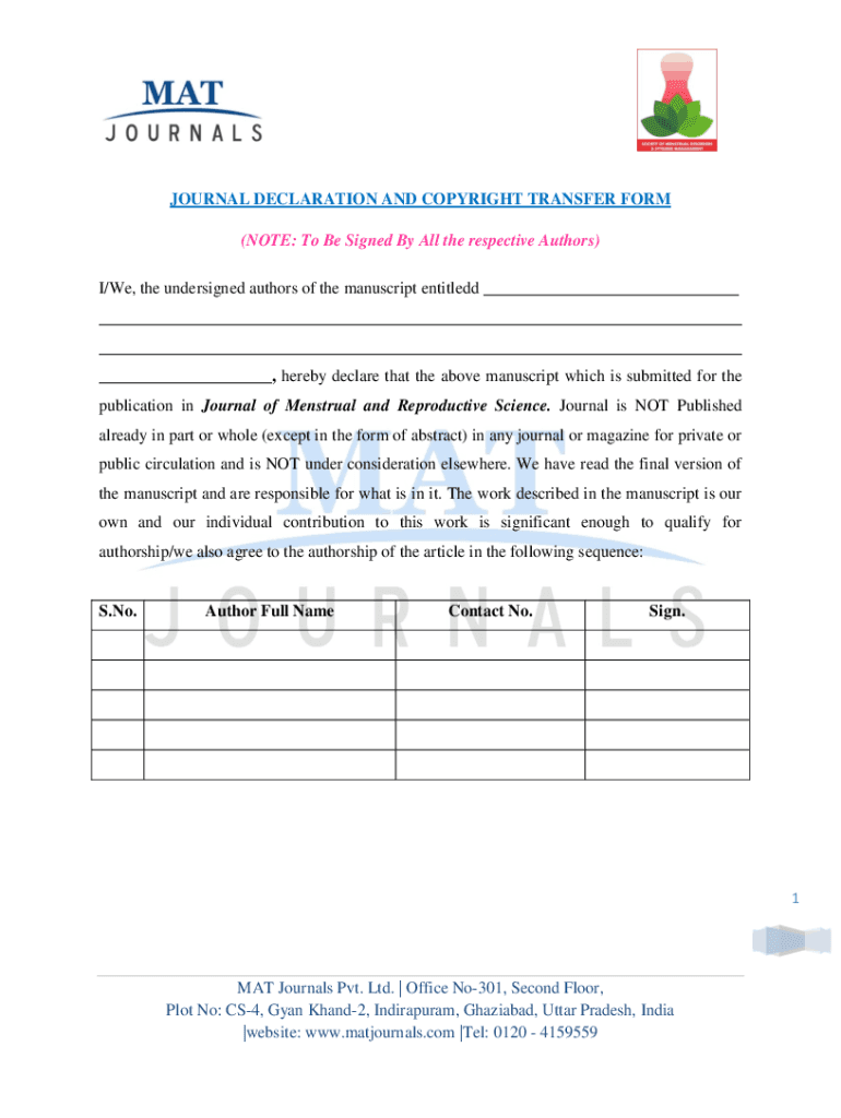 JOURNAL DECLARATION AND COPYRIGHT TRANSFER FORM (NOTE: To Be Signed By All the respective Authors) I/We, the undersigned authors of the manuscript entitled, hereby declare that the above manuscript