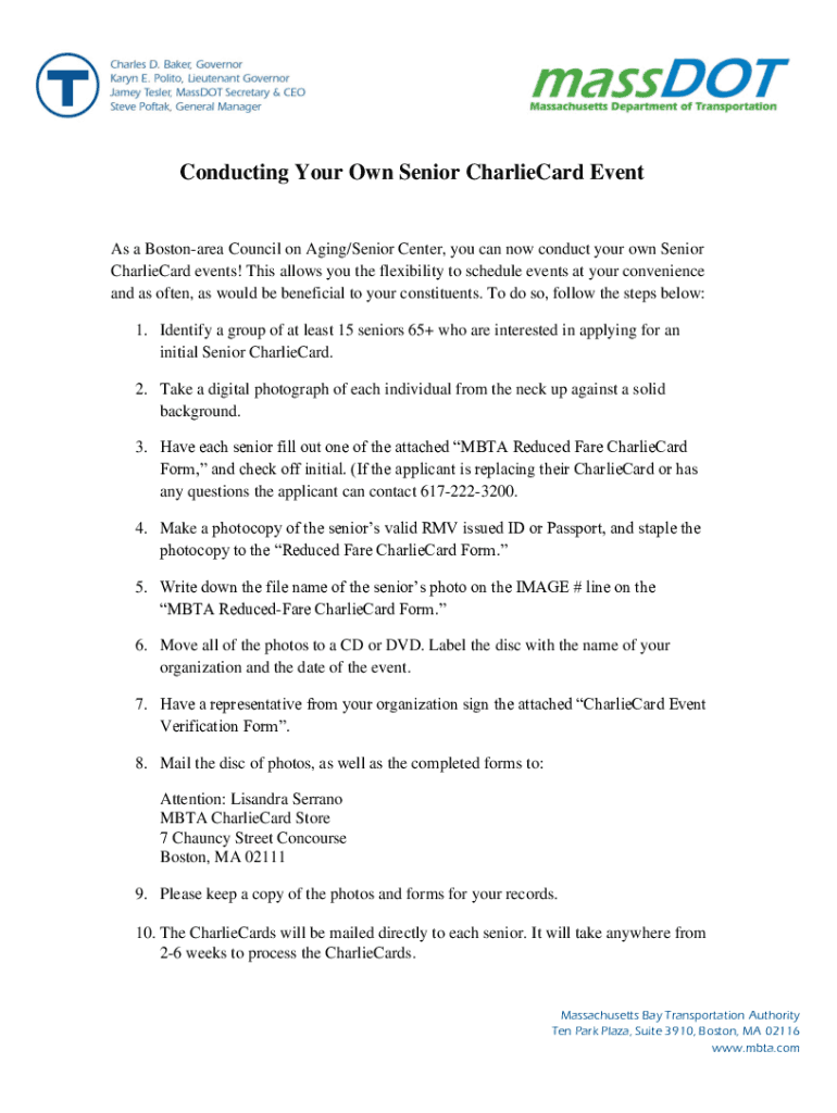 Conducting Your Own Senior CharlieCard Events a Boston area Council on Aging/Senior Center, you can now conduct your own Senior CharlieCard events! This allows you the flexibility to schedule events