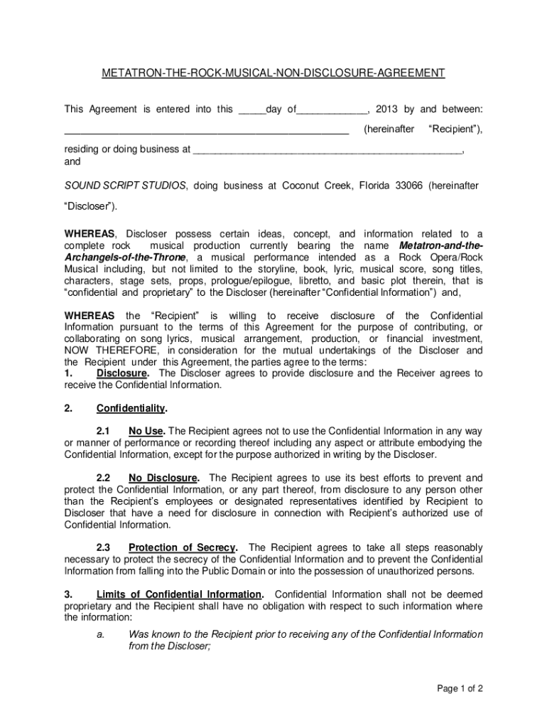 METATRONTHEROCKMUSICALNONDISCLOSUREAGREEMENT This Agreement is entered into this day of, 2013 by and between: (hereinafterRecipient), residing or doing business at, and SOUND SCRIPT STUDIOS, doing