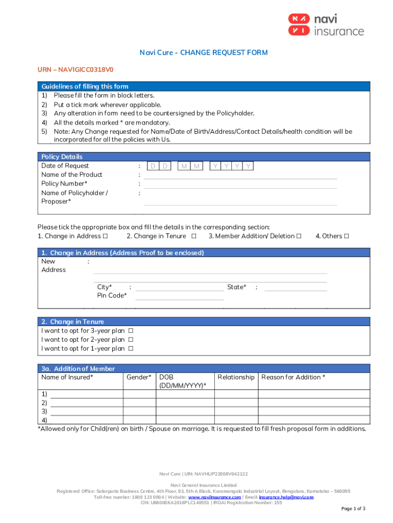 Navy Cure CHANGE REQUEST FORM URN NAVIGICC0318V0 Guidelines of filling this form 1) Please fill the form in block letters. 2) Put a tick mark wherever applicable. 3) Any alteration in form need to