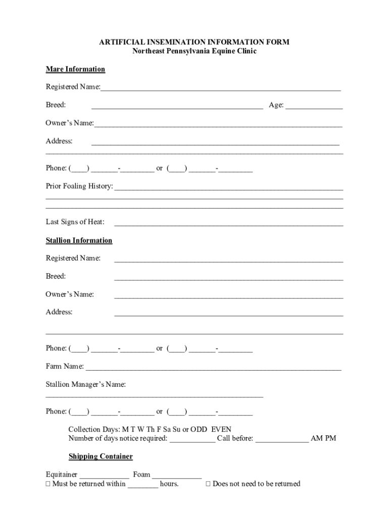 ARTIFICIAL INSEMINATION INFORMATION FORM Northeast Pennsylvania Equine Clinic Mare Information Registered Name: Breed: Age: Owners Name: Address: Phone: () or () Prior Foaling History: Last Signs