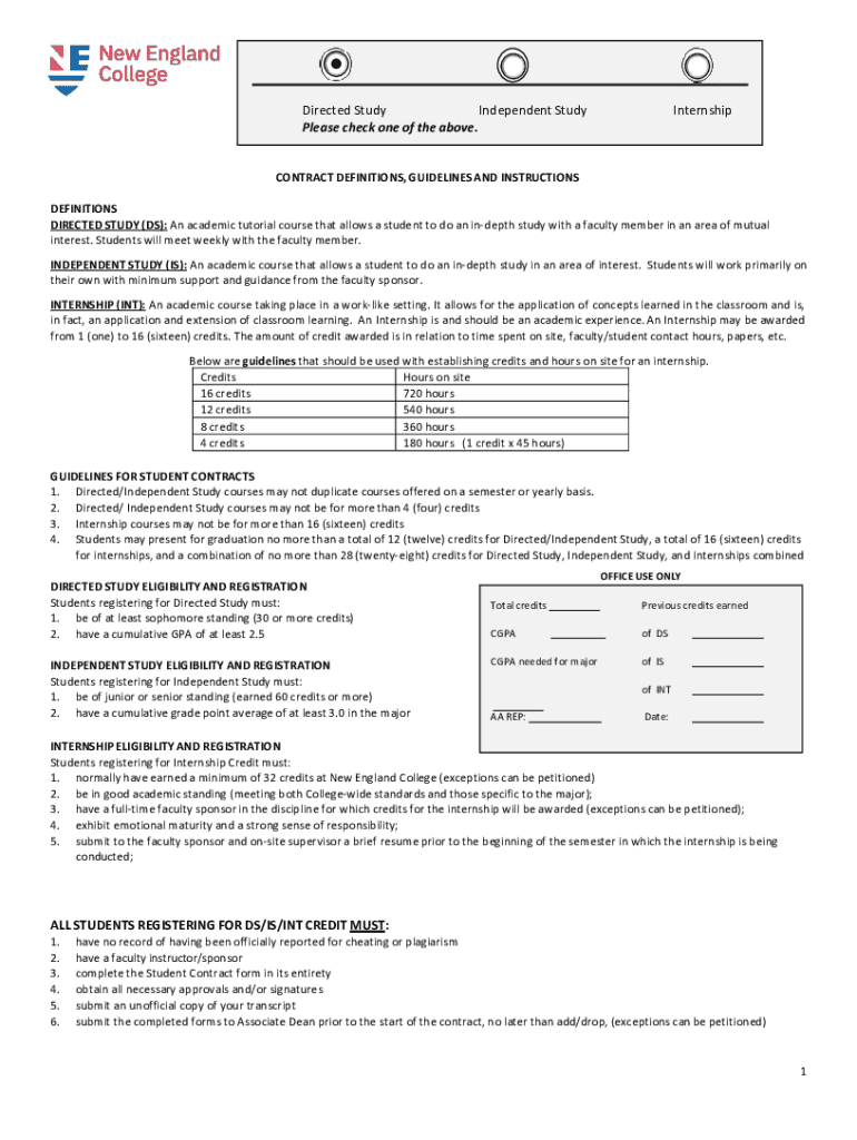 DirectedStudy IndependentStudy Pleasecheckoneoftheabove. InternshipCONTRACTDEFINITIONS, GUIDELINESANDINSTRUCTIONS DEFINITIONS DIRECTEDSTUDY(DS):Anacademictutorialcoursethatallowsastudenttodoanindepthstudywithafacultymemberinanareaofmutual