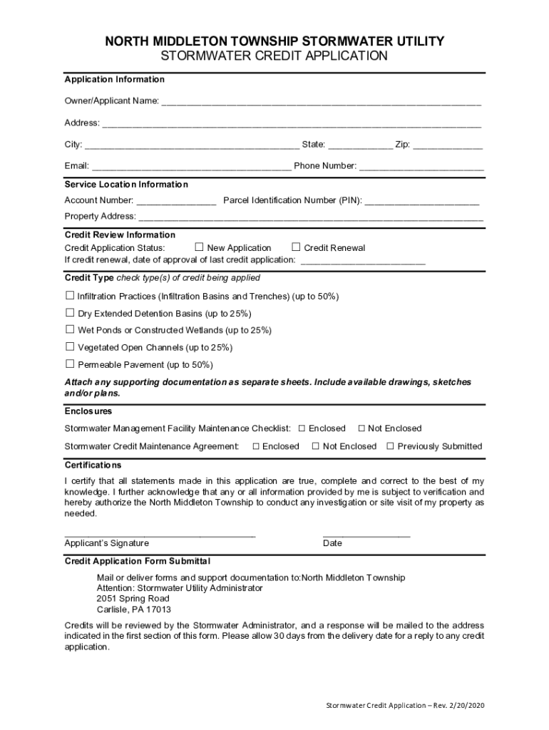 NORTH MIDDLETON TOWNSHIP STORMWATER UTILITY STORMWATER CREDIT APPLICATION Information Owner/Applicant Name: Address: City: State: Zip: Email: Phone Number: Service Location Information Account Number: