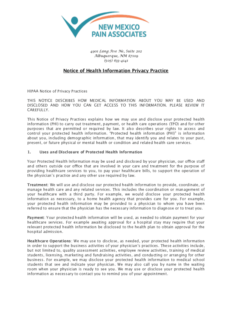 Get the free Notice of Health Information Privacy ... - NM Pain Associates