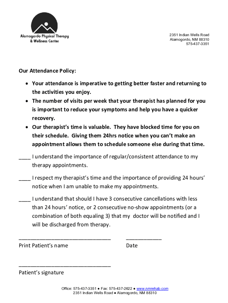 2351 Indian Wells Road Alamogordo, NM 88310 5754373351Our Attendance Policy: Your attendance is imperative to getting better faster and returning to the activities you enjoy. The number of visits