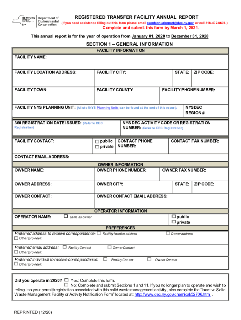 Recyclables Handling and Recovery Facility Annual Report instead of a Transfer Facility Annual Report. REGISTERED TRANSFER FACILITY ANNUAL REPORT aroRK Departmentof a TuN1TY Environmental If you need assistance filling out this form please email swmfannualreport dec.ny. Html. Annual Report Submit the Annual Report no later than March 1 2021. Reporting of the information indicated on this Transfer Facility Annual Report form is required pursuant to 6 NYCRR Part 360. DO NOT REPORT IN CUBIC...
