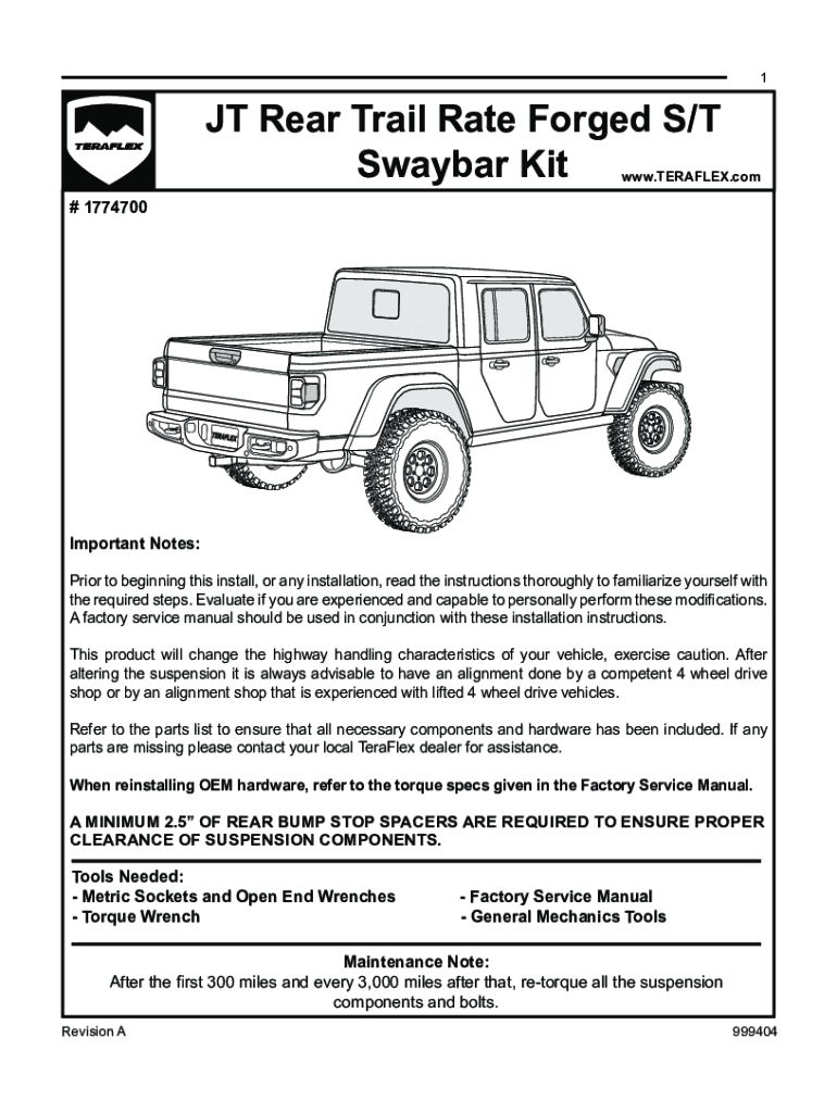 1JT Rear Trail Rate Forged S/T Sway bar Kit.TERAFLEX.com# 1774700Important Notes: Prior to beginning this installs, or any installation, read the instructions thoroughly to familiarize yourself with