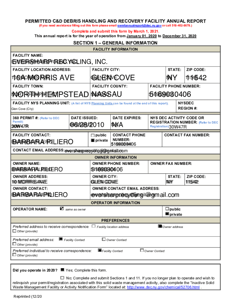 PERMITTED C&D DEBRIS HANDLING AND RECOVERY FACILITY ANNUAL REPORT (If you need assistance filling out this form please email swmfannualreport DEC.NY.gov or call 5184028678.) Complete and submit this
