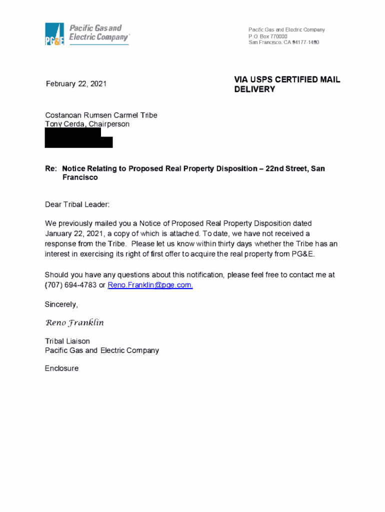 Pacific Gas and Electric Company February 22, 2021Pacfic I Gas and Electric Company P.O. Box 770000 CA 941771490 San Francisco. Via USPS CERTIFIED MAIL DELIVERYCostanoan Rum sen Carmel Tribe Ton CERFA
