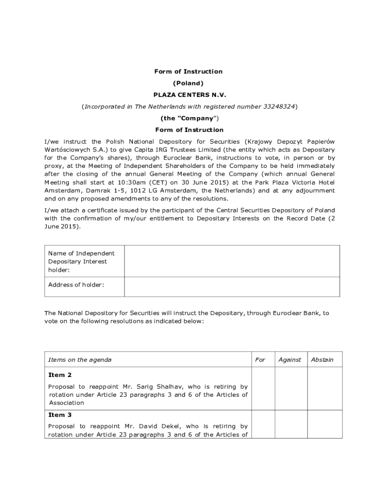 Form of Instruction (Poland) PLAZA CENTERS N.V. (Incorporated in The Netherlands with registered number 33248324) (the Company) Form of Instruction I/we instruct the Polish National Depository for