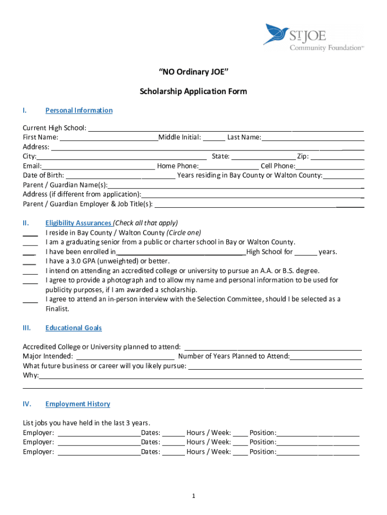 NO Ordinary JOE Scholarship Application Form I. Personal InformationCurrent High School: First Name: Middle Initial: Last Name: Address: City: State: Zip: Email: Home Phone: Cell Phone: Date of Birth: