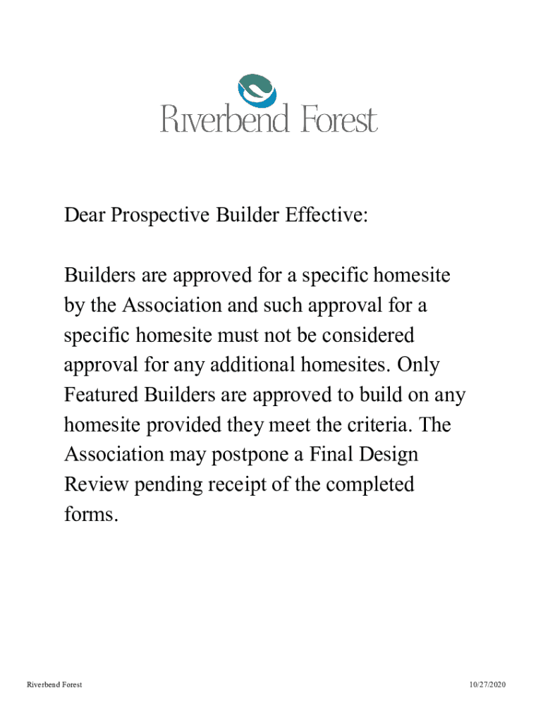 Dear Prospective Builder Effective: Builders are approved for a specific home site by the Association and such approval for a specific home site must not be considered approval for any additional