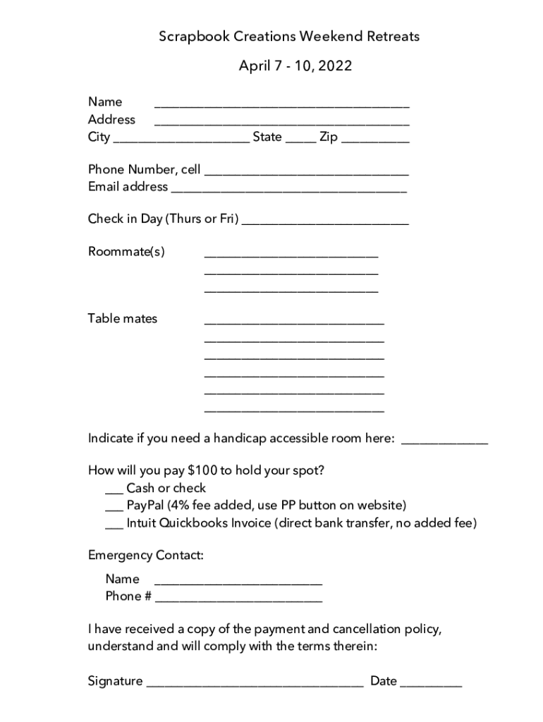 Scrapbook Creations Weekend Retreats April 7 10, 2022 Name Address City State Zip Phone Number, cell Email address Check in Day (Thurs or Fri) Roommate(s) Table mates Indicate if you need a handicap
