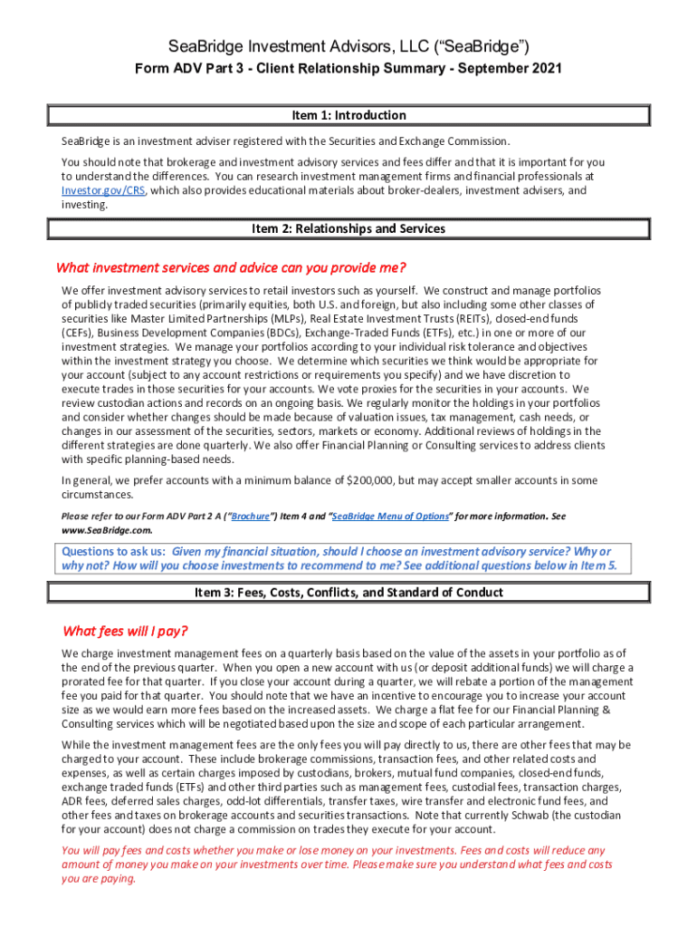 Abridge Investment Advisors, LLC (Abridge) Form ADV Part 3 Client Relationship Summary September 2021 Item1:Introduction SeaBridgeisaninvestmentadviserregisteredwiththeSecuritiesandExchangeCommission.