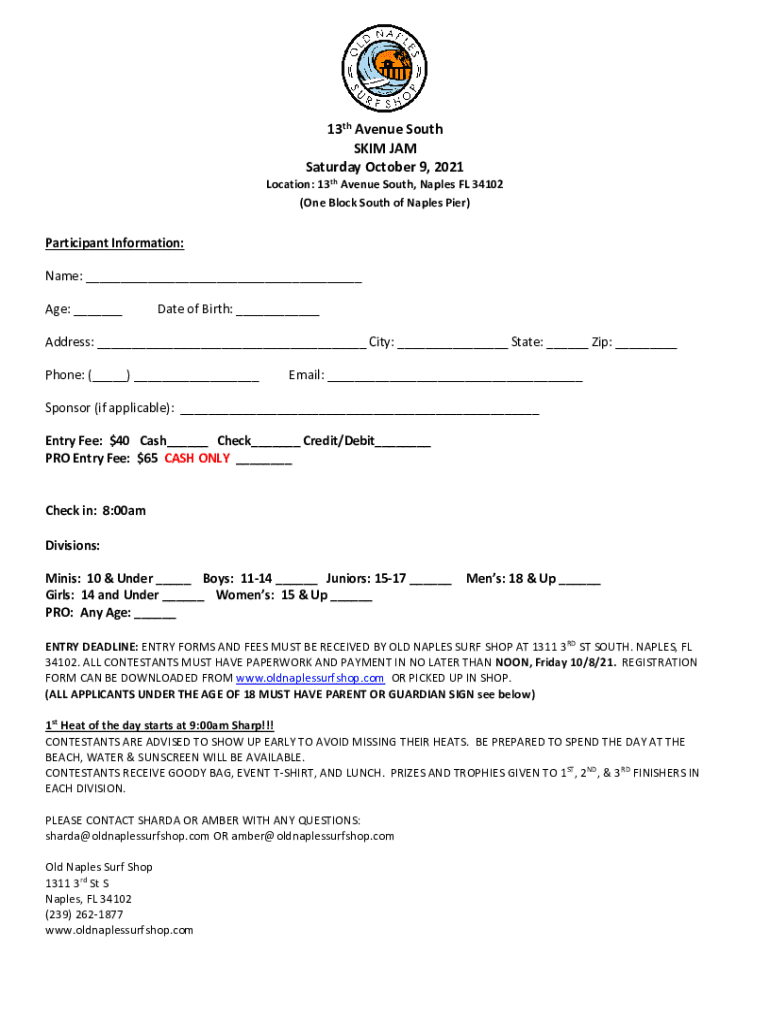 13th Avenue South SKIM JAM Saturday, October 9, 2021, Location: 13th Avenue South, Naples FL 34102 (One Block South of Naples Pier)Participant Information: Name: Age: Date of Birth: Address: City: