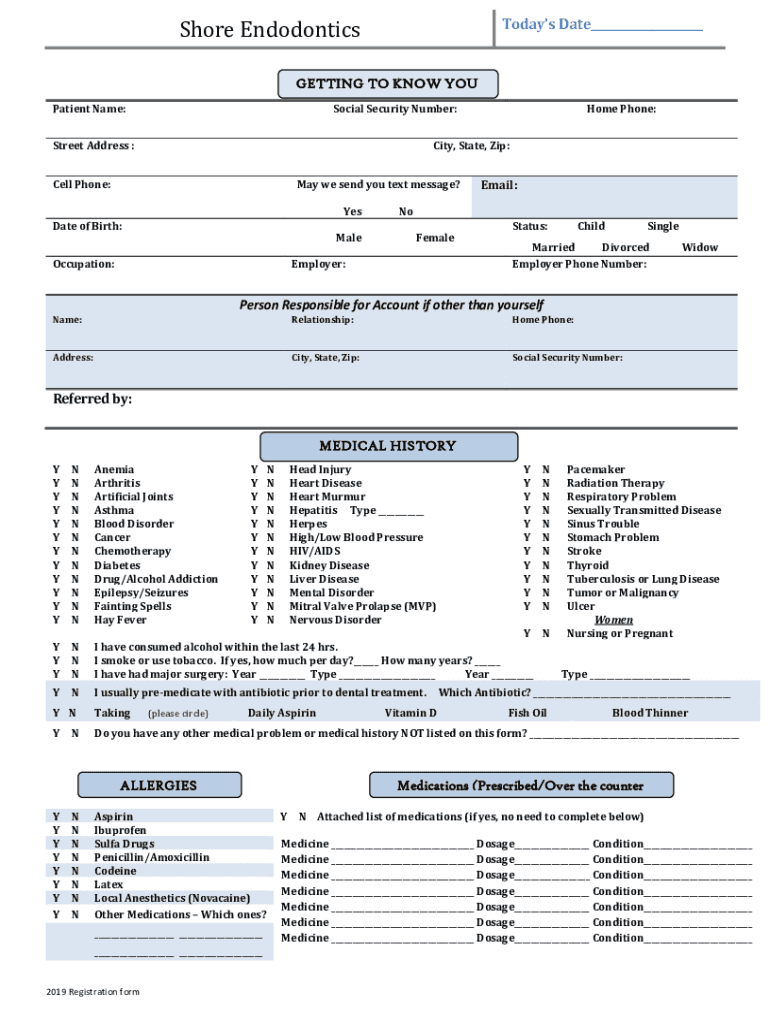 Today's Date Shore EndodonticsGETTING TO KNOW YOU Patient Name:Social Security Number:Street Address :Home Phone:City, State, Zip:Cell Phone:May we send you text message? Email:Renovate of Birth:MaleFemaleOccupation:Employer:Status:ChildSingleMarriedDivorcedWidowEmployer
