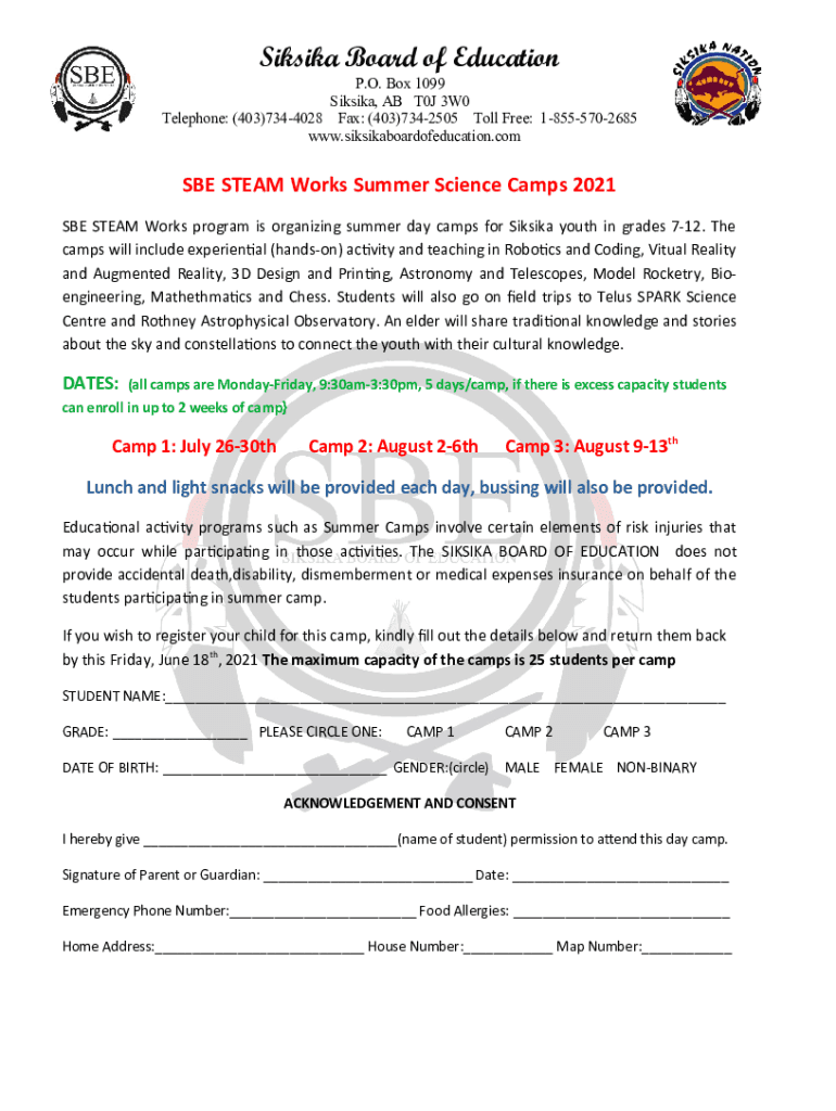 Silesia Board of Education P.O. Box 1099 Silesia, AB T0J 3W0 Telephone: (403)7344028 Fax: (403)7342505 Toll Free: 18555702685 www.siksikaboardofeducation.comSBE STEAM Works Summer Science Camps 2021