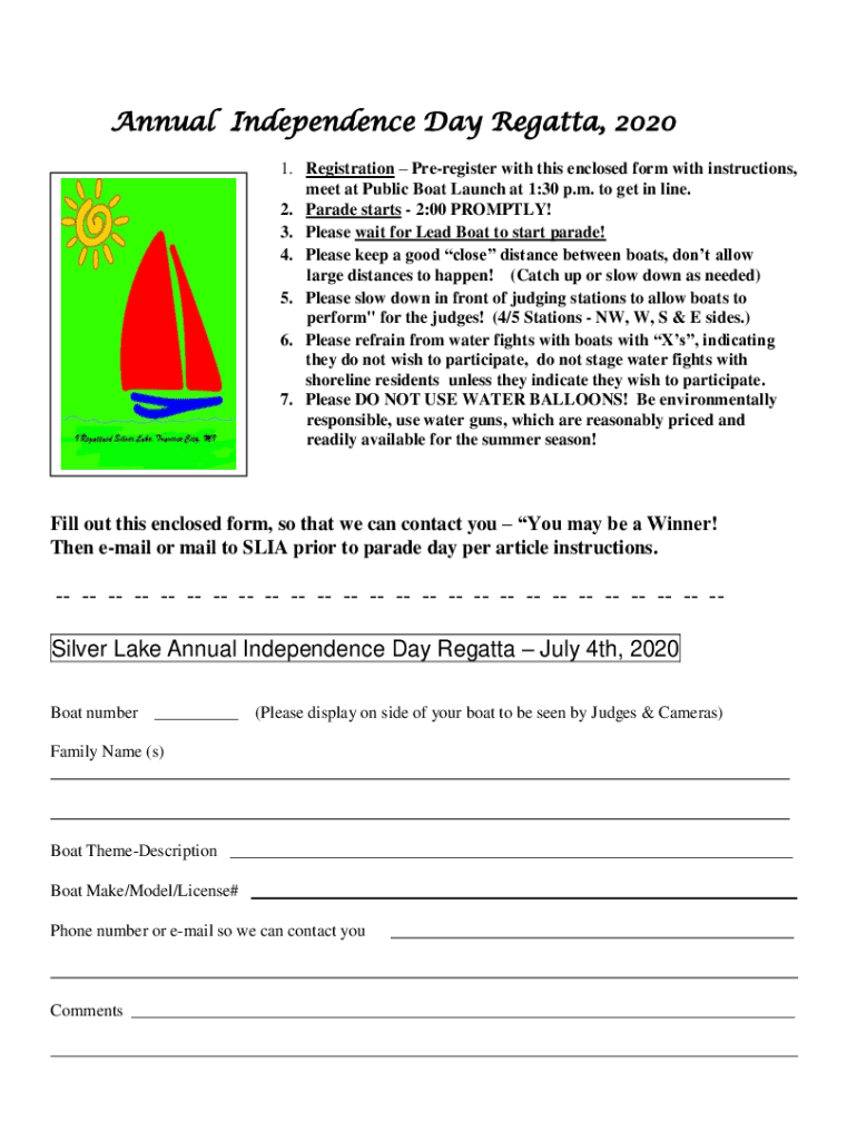 Annual Independence Day Regatta, 2020 1. Registration Preregister with this enclosed form with instructions, meet at Public Boat Launch at 1:30 p.m. to get in line. 2. Parade starts 2:00 PROMPTLY!