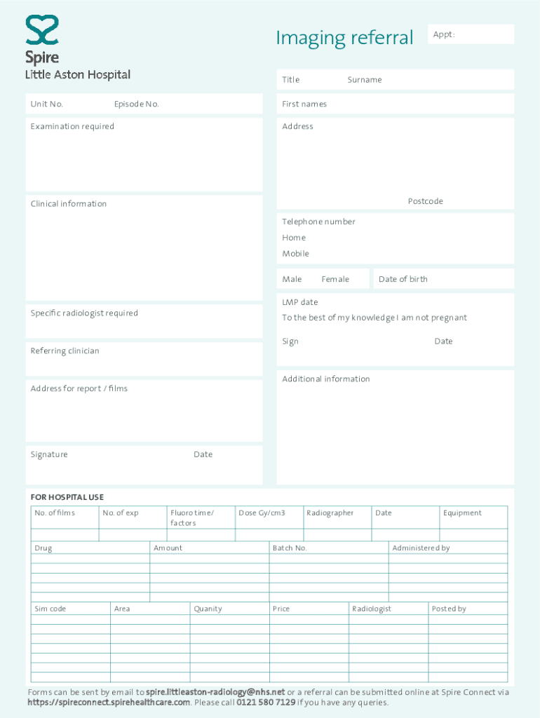 Imaging referral Title Unit No. Episode No. Apt:SurnameFirst namesExamination requiredAddressPostcodeClinical information Telephone number Home Mobile MaleFemaleDate of birth LMP date Specific radiologist