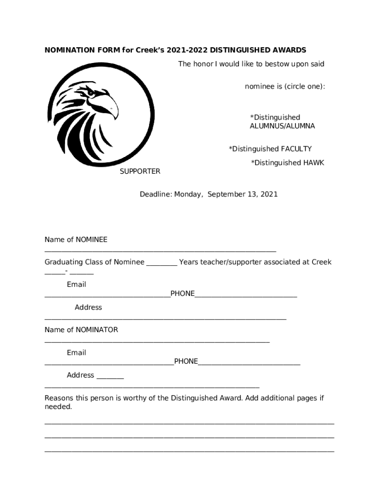 Instructions for the form NOMINATION for Creek's 2021-2022 DISTINGUISHED AWARDS