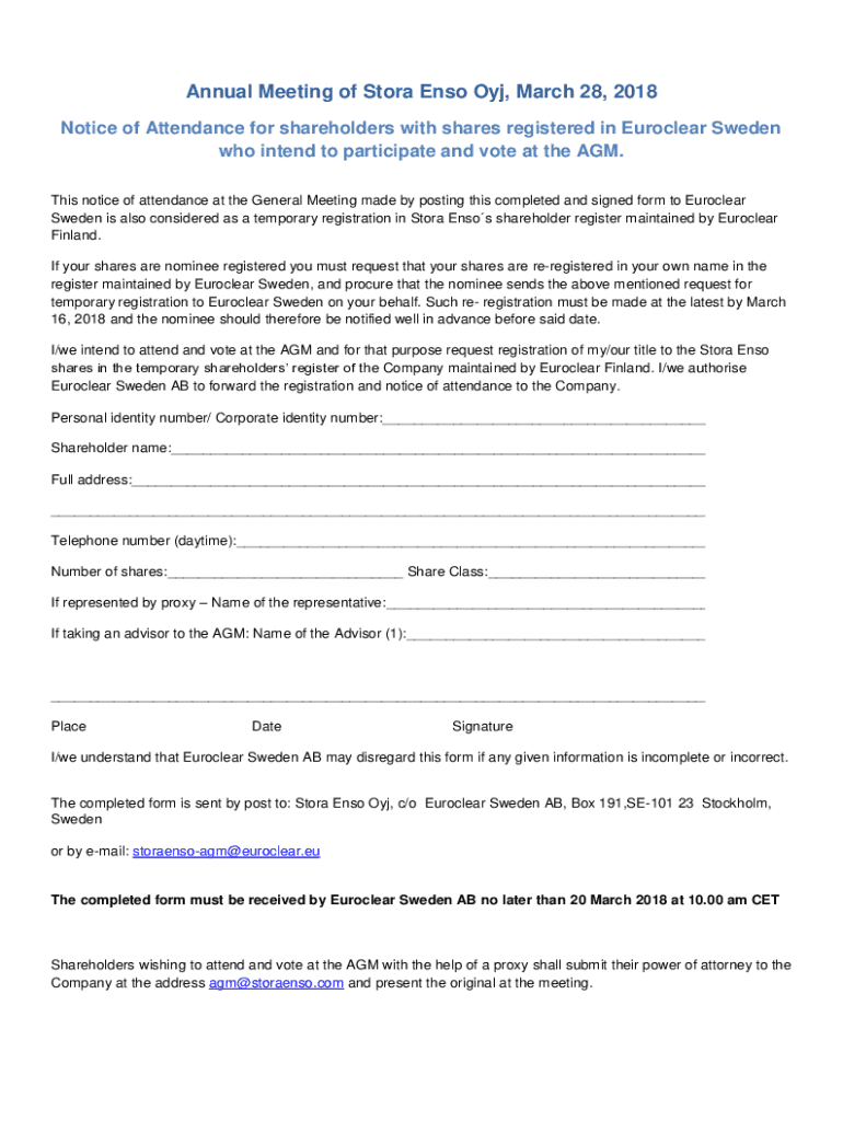 Annual Meeting of Story ENSO Obj, March 28, 2018, Notice of Attendance for shareholders with shares registered in Euro clear Sweden who intend to participate and vote at the AGM. This notice of attendance