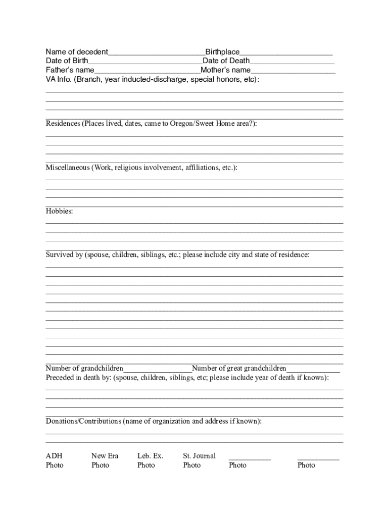 Name of decedent Birthplace Date of Birth Date of Death Fathers name Mothers name VA Info. (Branch, year inducted discharge, special honors, etc): Residences (Places lived, dates, came to Oregon/Sweet