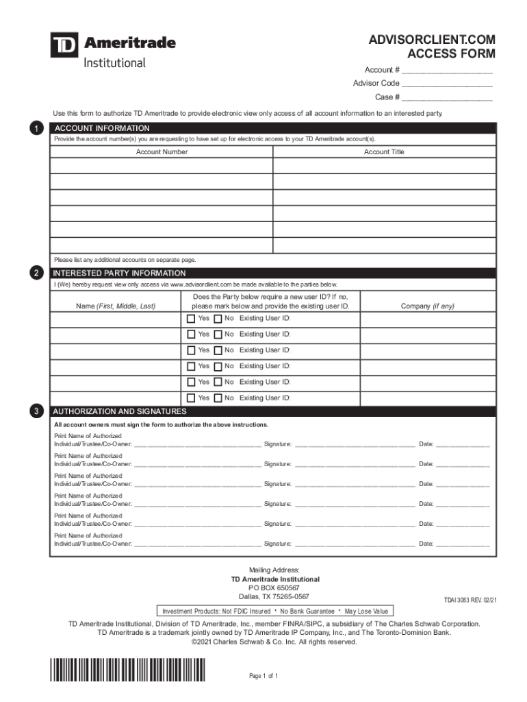 Reset FormADVISORCLIENT.COM ACCESS FORM Account # Advisor Code Case # Use this form to authorize TD Ameliorates to provide electronic view only access of all account information to an interested party.1ACCOUNT