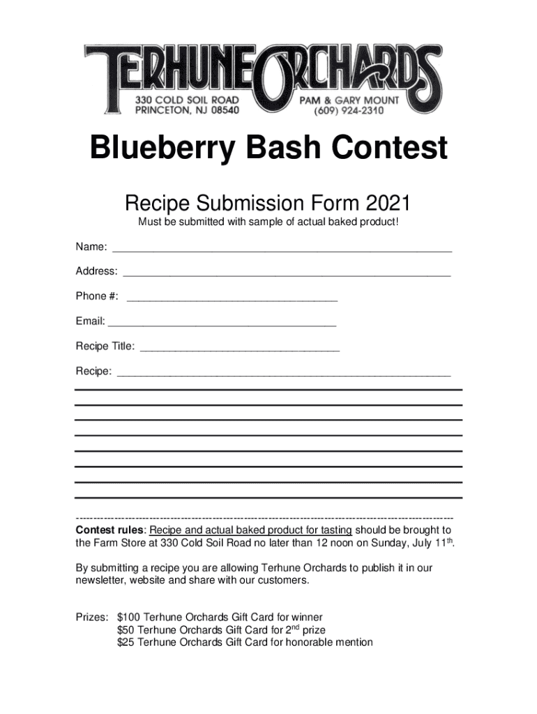 Blueberry Bash Contest Recipe Submission Form 2021 Must be submitted with sample of actual baked product! Name: Address: Phone #: Email: Recipe Title: Recipe: Contest rules: Recipe and actual baked