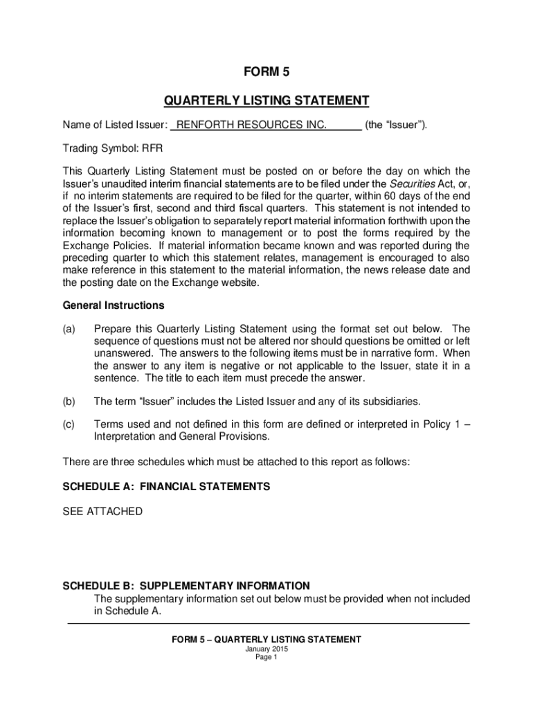 FORM 5 QUARTERLY LISTING STATEMENT Name of Listed Issuer: DANFORTH RESOURCES INC. (the Issuer). Trading Symbol: RFR This Quarterly Listing Statement must be posted on or before the day on which the