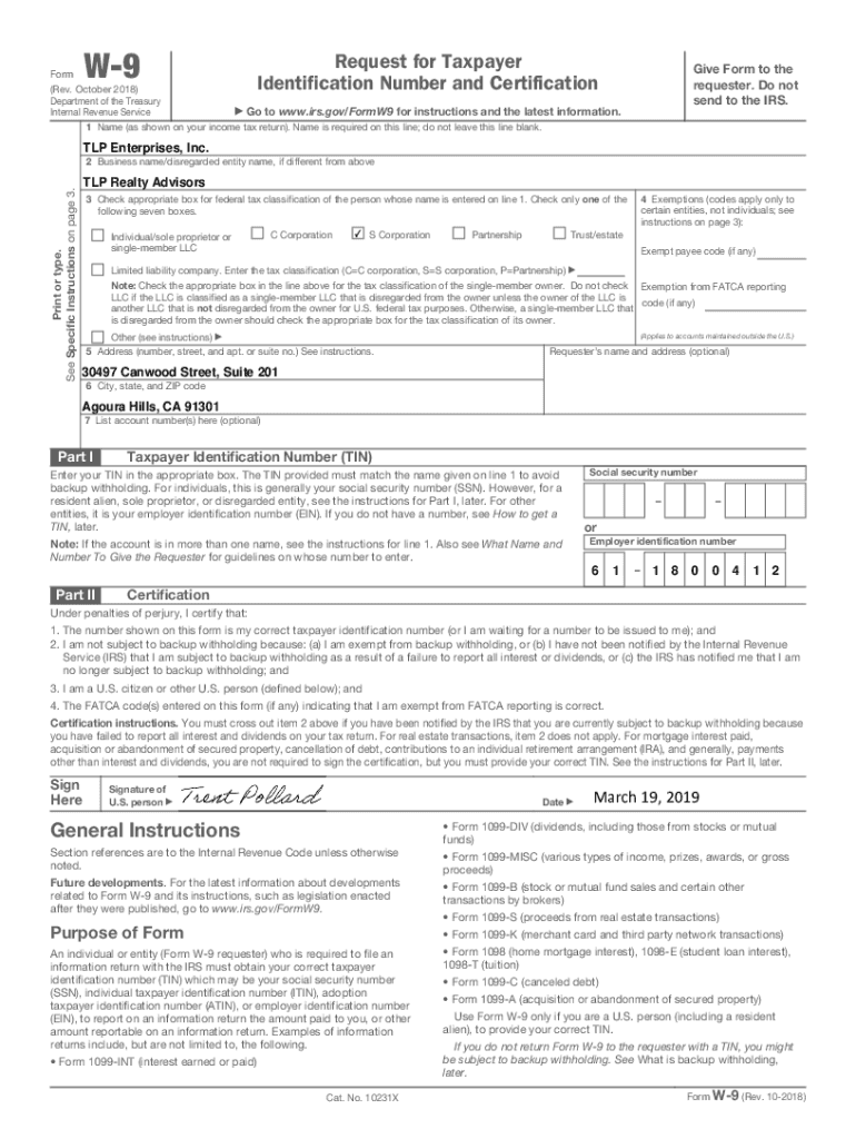 W9Form (Rev. October 2018) Department of the Treasury Internal Revenue ServiceRequest for Taxpayer Identification Number and Certification give Form to the requester. Do not send to the IRS. Go to