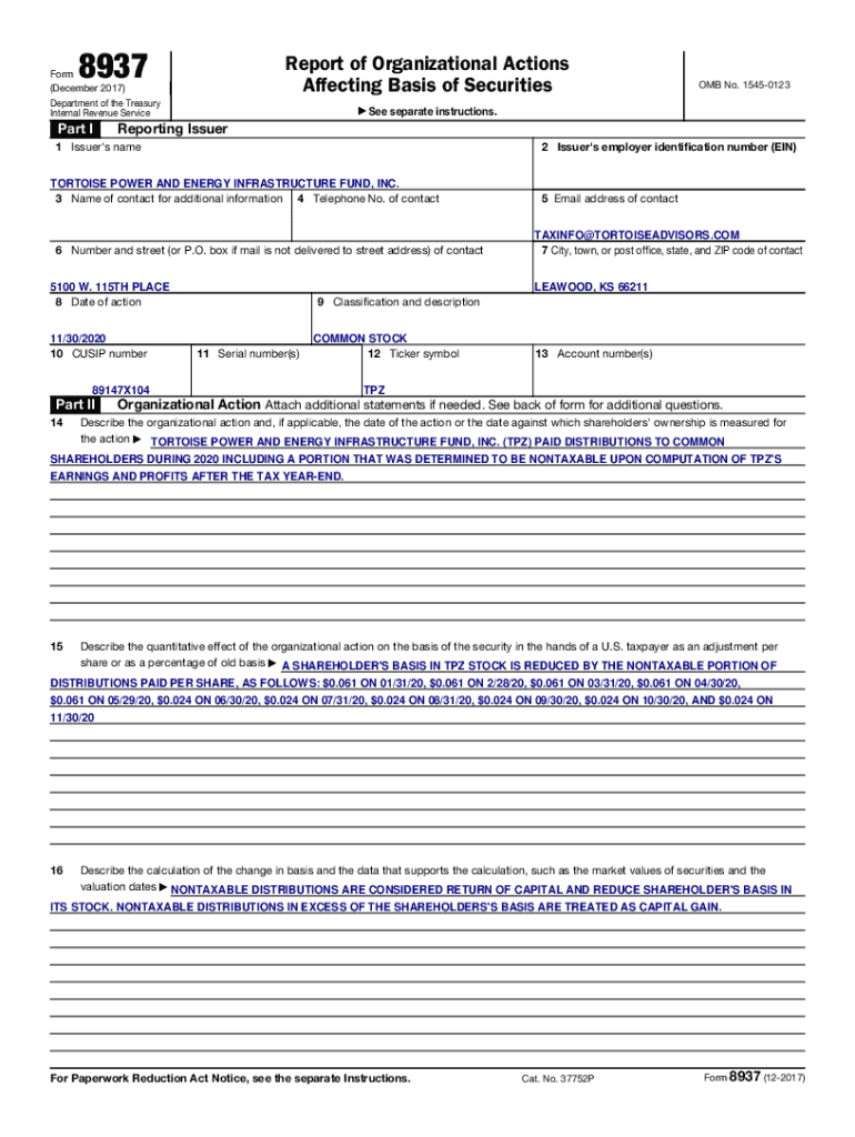 8937Report of Organizational Actions Affecting Basis of SecuritiesForm (December 2017) Department of the Treasury Internal Revenue Serviceman I See separate instructions. Reporting Issuer1 Issuer\'s